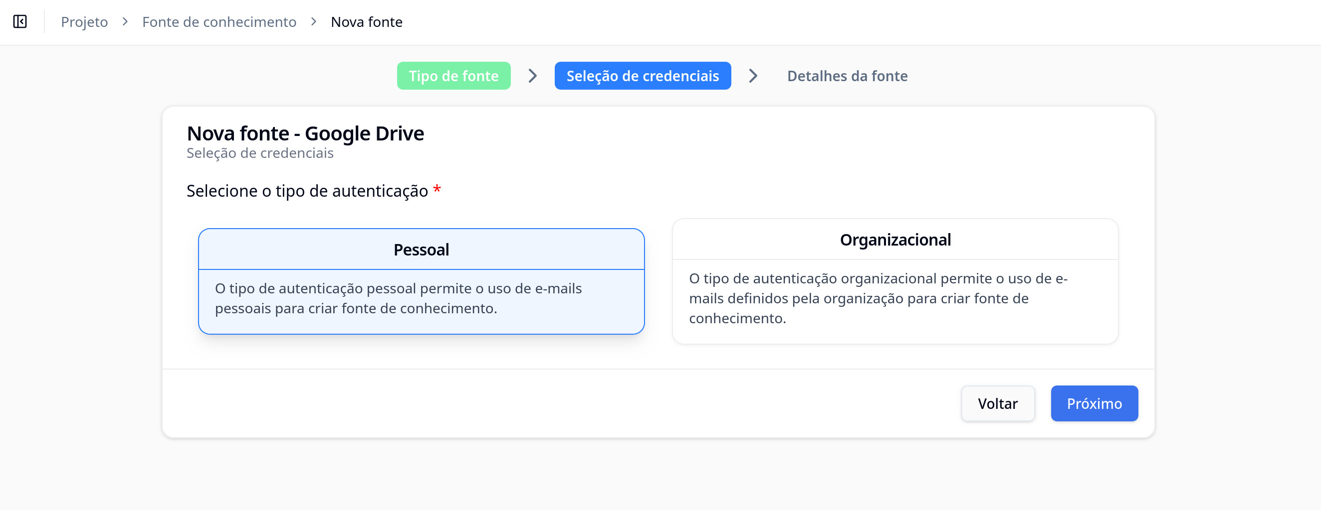 For source types that require authentication (like Google Drive, Confluence, Jira), you will need to select or create a credential before you can proceed to detail configuration.